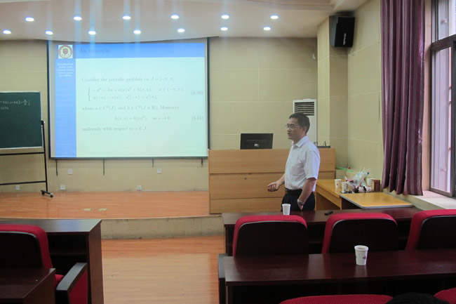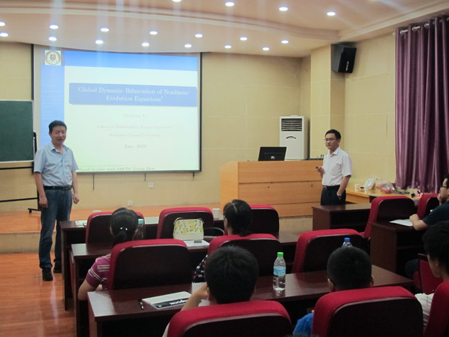 在第一场报告中,李德生教授介绍了非线性发展方程的全局动态分支性质,证明了度量空间中动态分支的全局连续性,并给出其在Banach 空间中发展方程问题的具体应用实例。