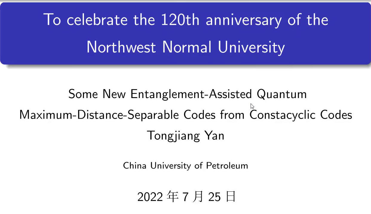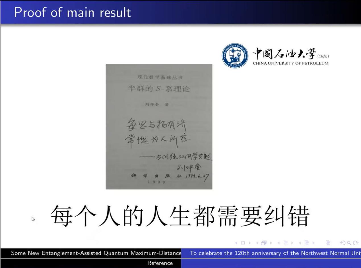 7月25日上午第二场报告,中国石油大学闫统江教授介绍了自己在新的纠缠辅助量子MDS常循环码方面的研究工作。报告最后,闫统江教授展示了导师刘仲奎教授在23年前给他的临别寄语,感谢母校对自己的培养。