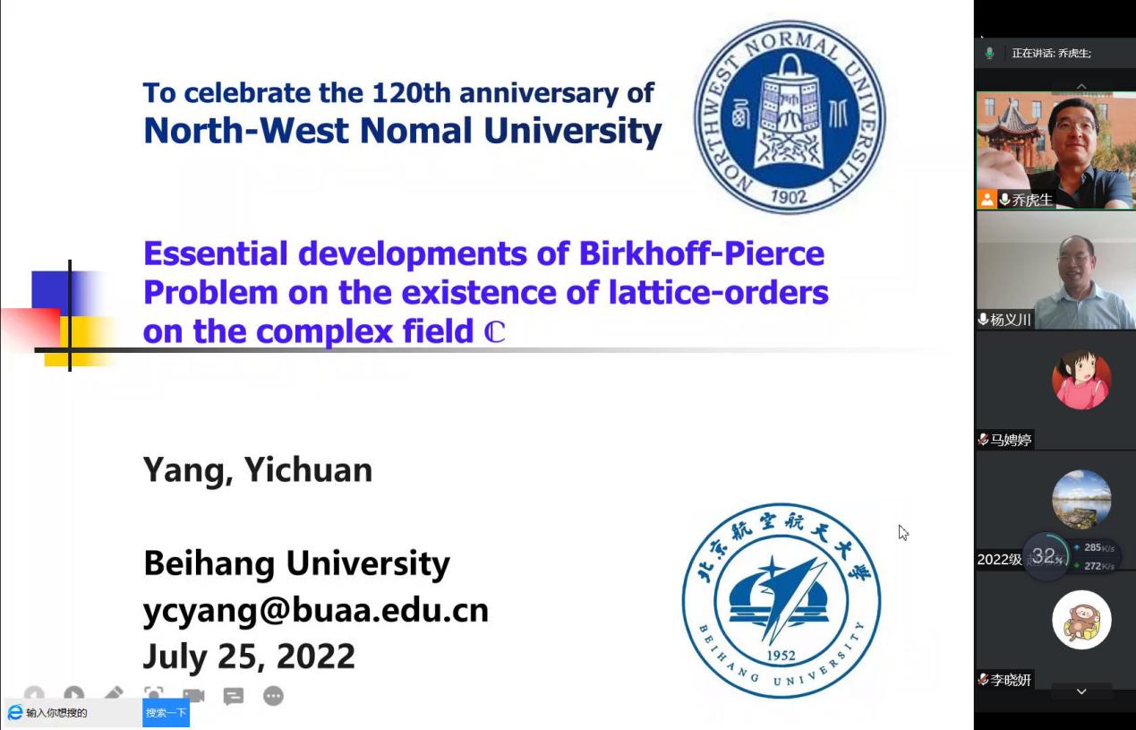 7月25日上午第一场报告,北京航空航天大学杨义川教授从实数的全序开始,介绍了关于格序的Birkhoff-Pierce公开问题的研究背景及自己关于这一问题的研究工作。杨教授的报告内容很好地与课程思政结合,将学问融入学术问题的讲解,为广大师生上了生动形象的一节课。在报告的最后,杨义川教授在表达对母校深厚情感的同时,对母校近年取得的良好成绩表示祝贺,同时对我院学子的未来寄予殷切希望。