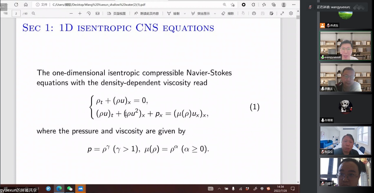 7月28日下午,兰州大学王跃循教授主要讲述了他与合作者关于黏性Saint-Venant系统自由边界问题经典解的适定性理论方面的最新研究成果。